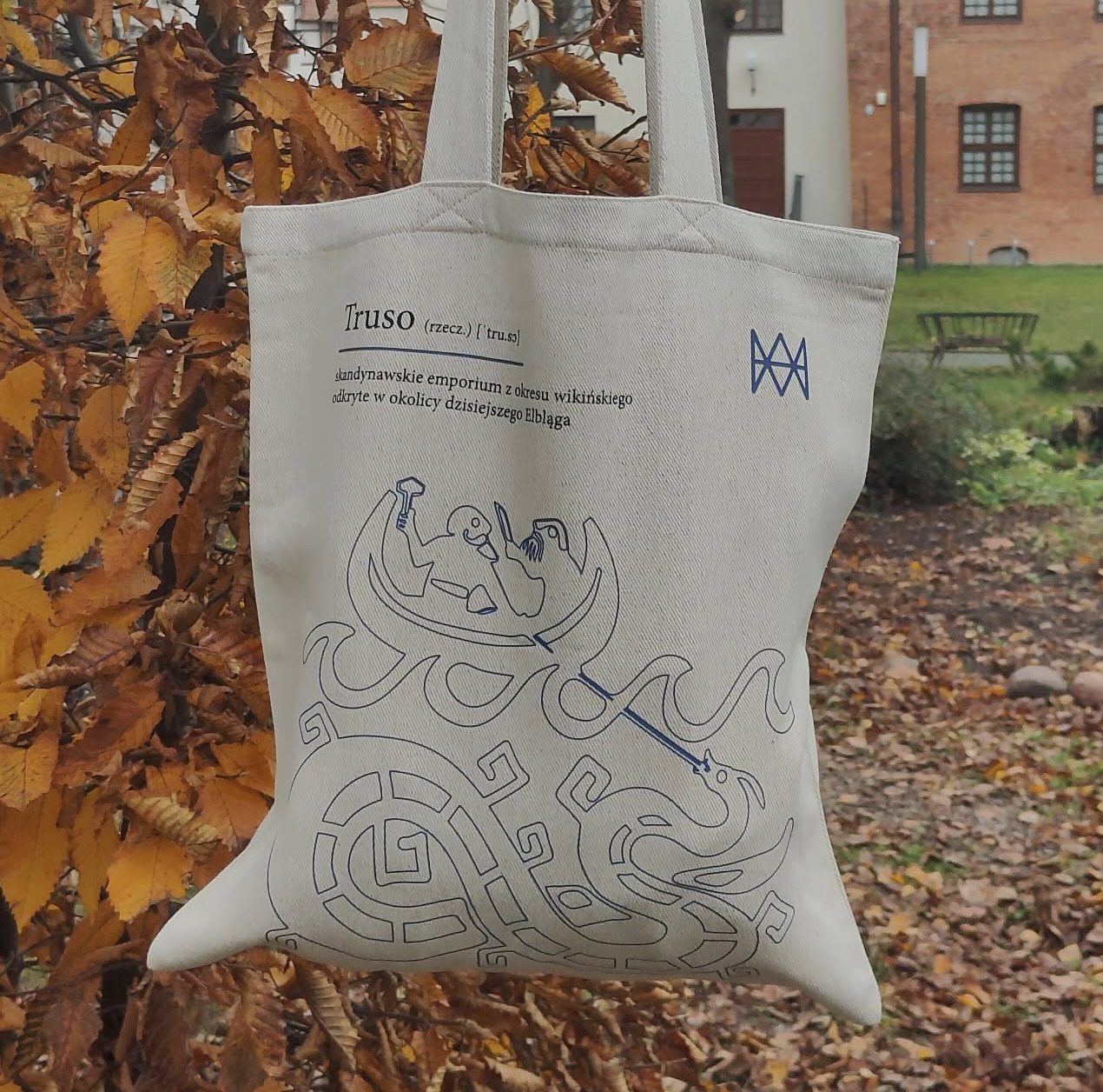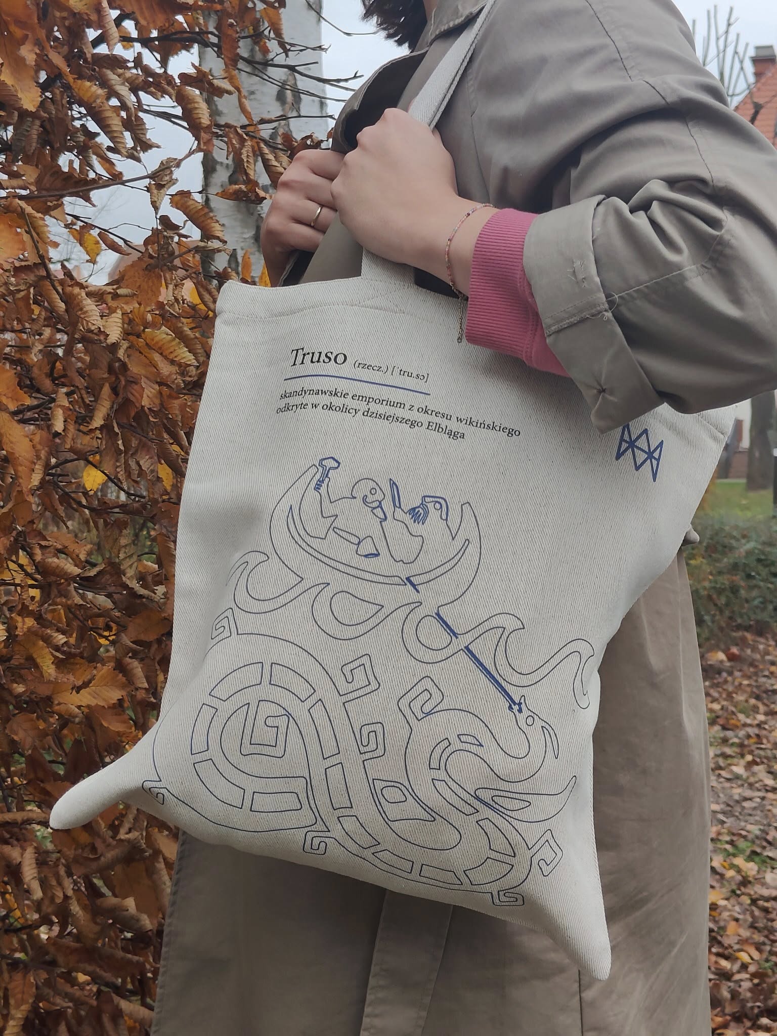 Torb uszyta z bawełniano-konopnej tkaniny, ozdobiona wzorem inspirowanym mitologią wikińską.